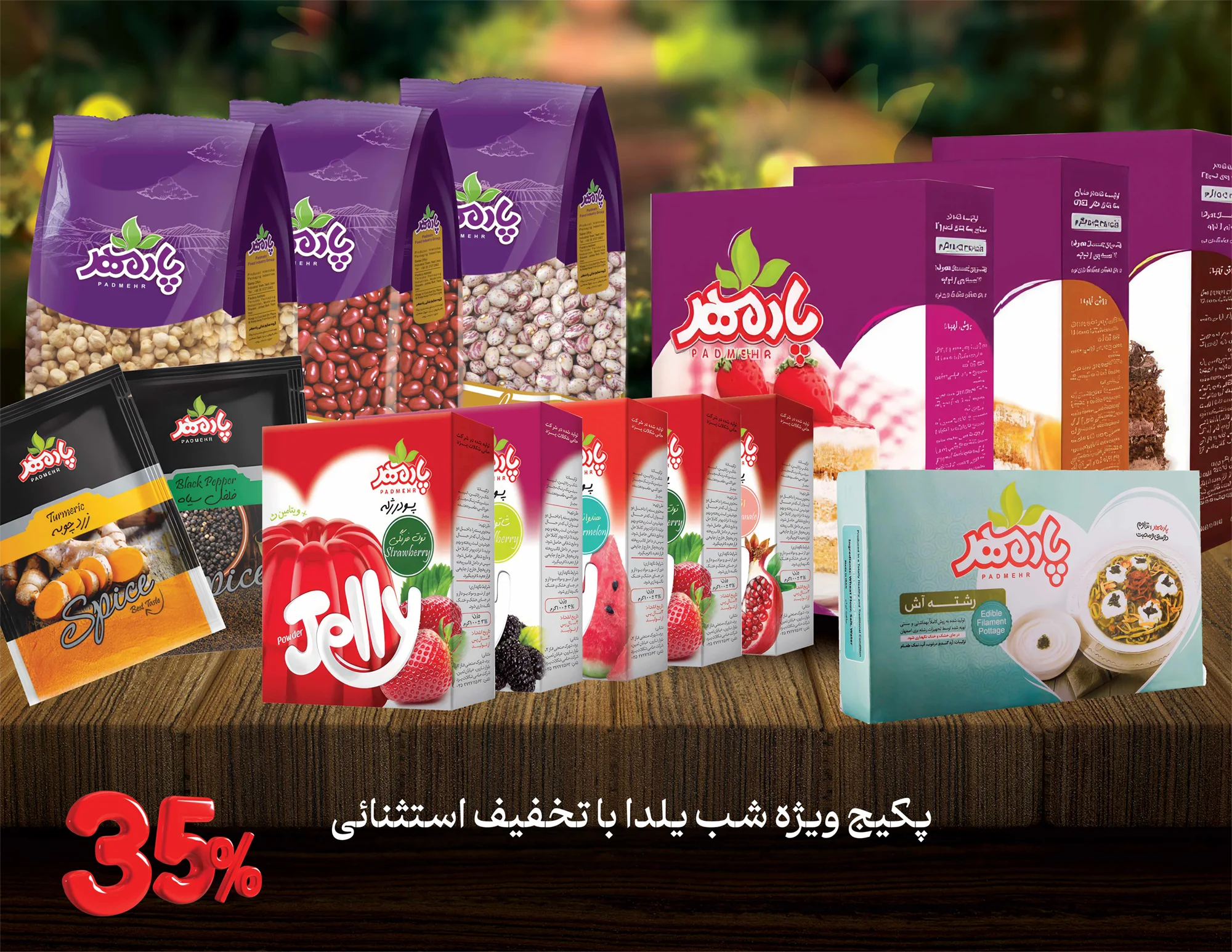 تمام ملزومات دسر و غذای شب یلدا از برند پادمهر در یک پک! شامل بهترین پودر ژله، پودر کیک، رشته آش و حبوبات با 35% تخفیف.